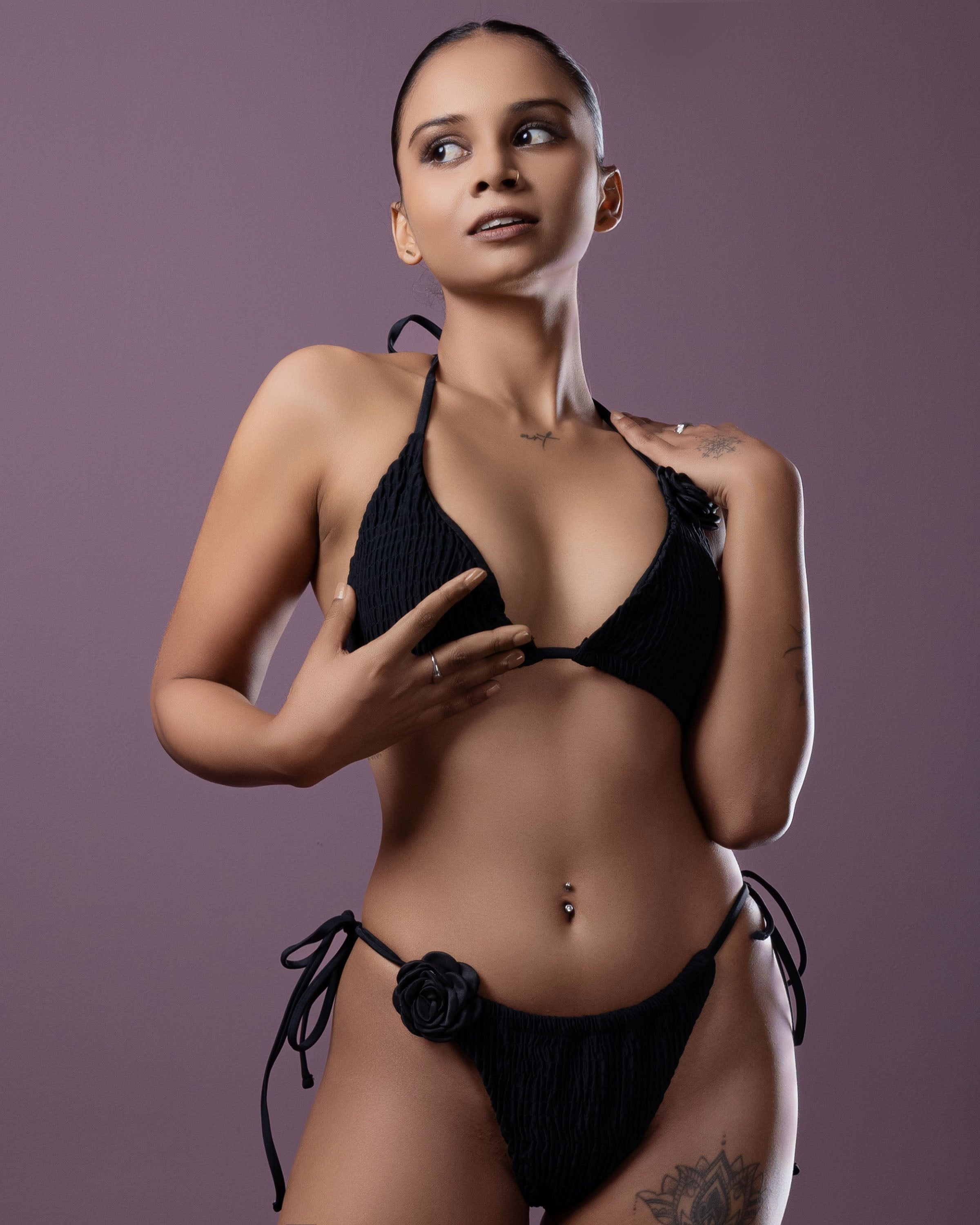 A bold yet elegant two-piece bikini featuring delicate rosette details on the top and bottom.