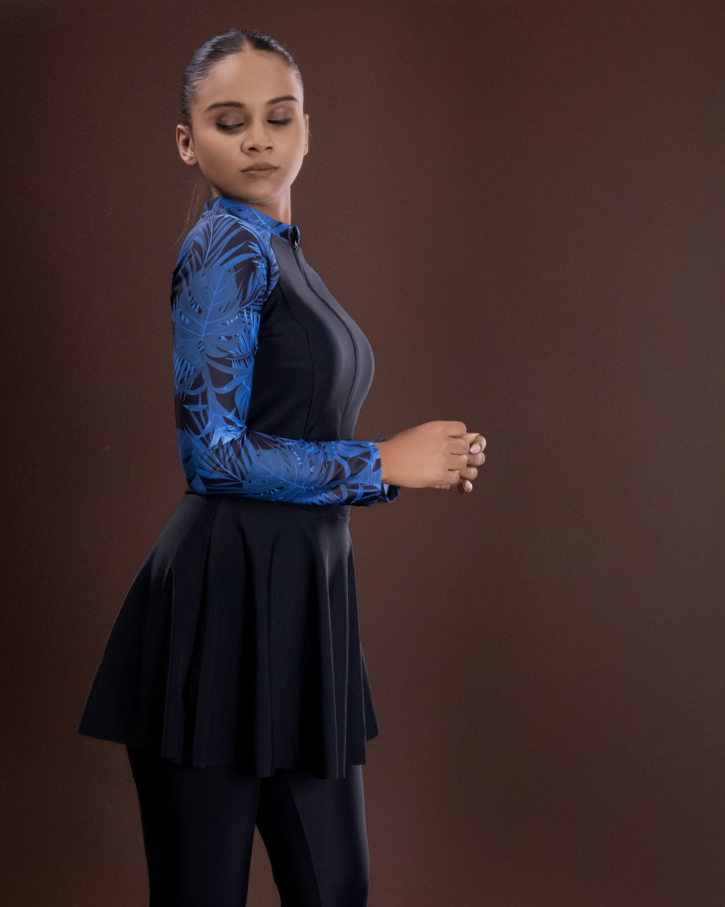 Chic and flattering with tropical-print sleeves and a skirt overlay. Quick-dry stretch fabric keeps you comfy, stylish, and covered for beach or pool.